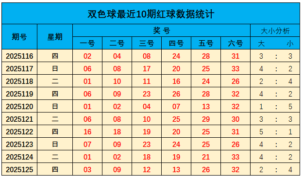 上期红球大小比为2:4,近10期大小比为32:28;总体上大奖号走势稍热,本期关注大数较上期走势保持,推荐大小比为:2:4